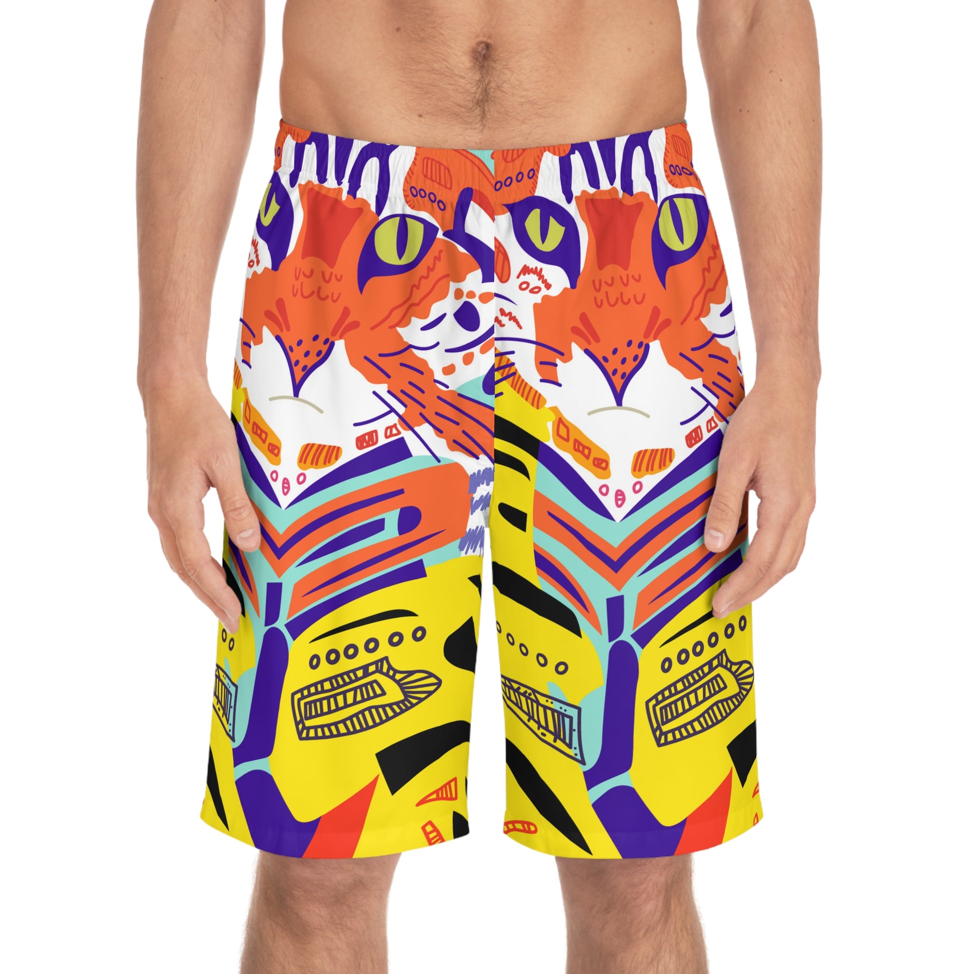 Bold Cat Face Board Shorts — Colorful Tropical Surf Trunks