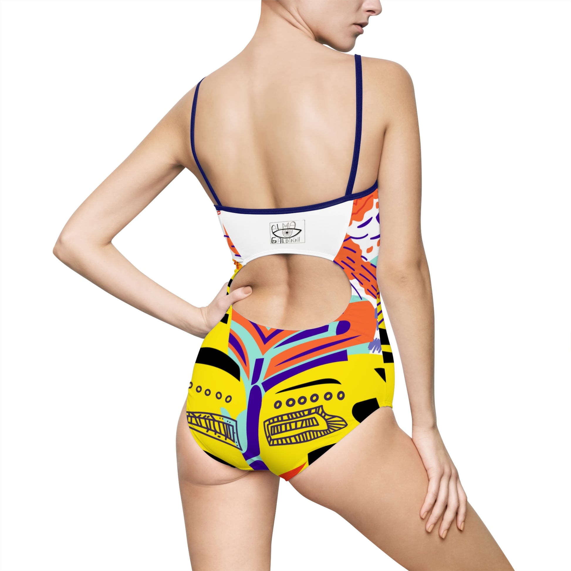 Bright, playful, and built for movement — this one-piece swimsuit brings bold, hand-drawn color to beach days and poolside afternoons. The low-back cutout and slim elastic straps keep the silhouette sleek and easy to wear while an internal chest elastic adds supportive shaping. Lightweight, stretchy fabric hugs curves without restricting motion, and the all-over print stays vivid so the artwork reads beautifully from every angle. Wear it to splash around at a summer party, frame a seaside photo shoot, or slip it on for a weekend getaway where you want to stand out and feel confident.