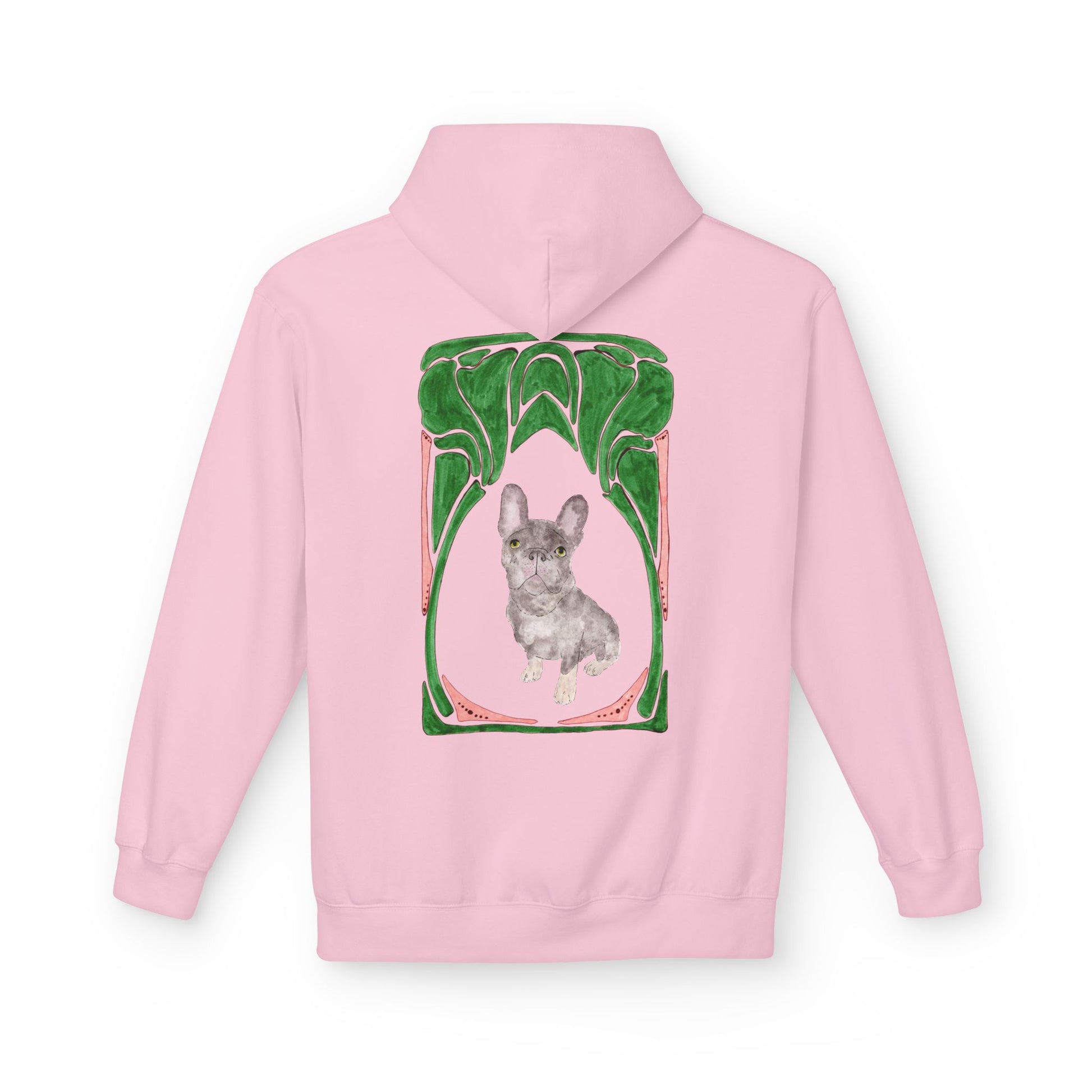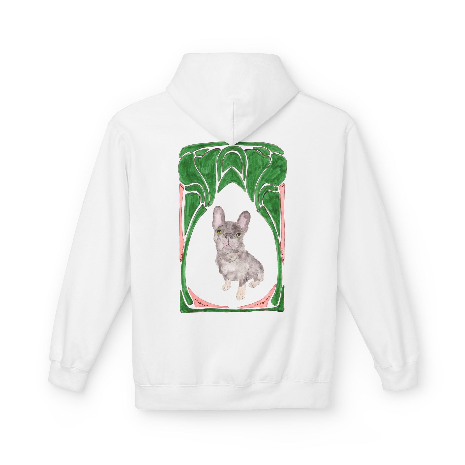 French Bulldog Art Hoodie — Watercolor with Green Frame Back Print