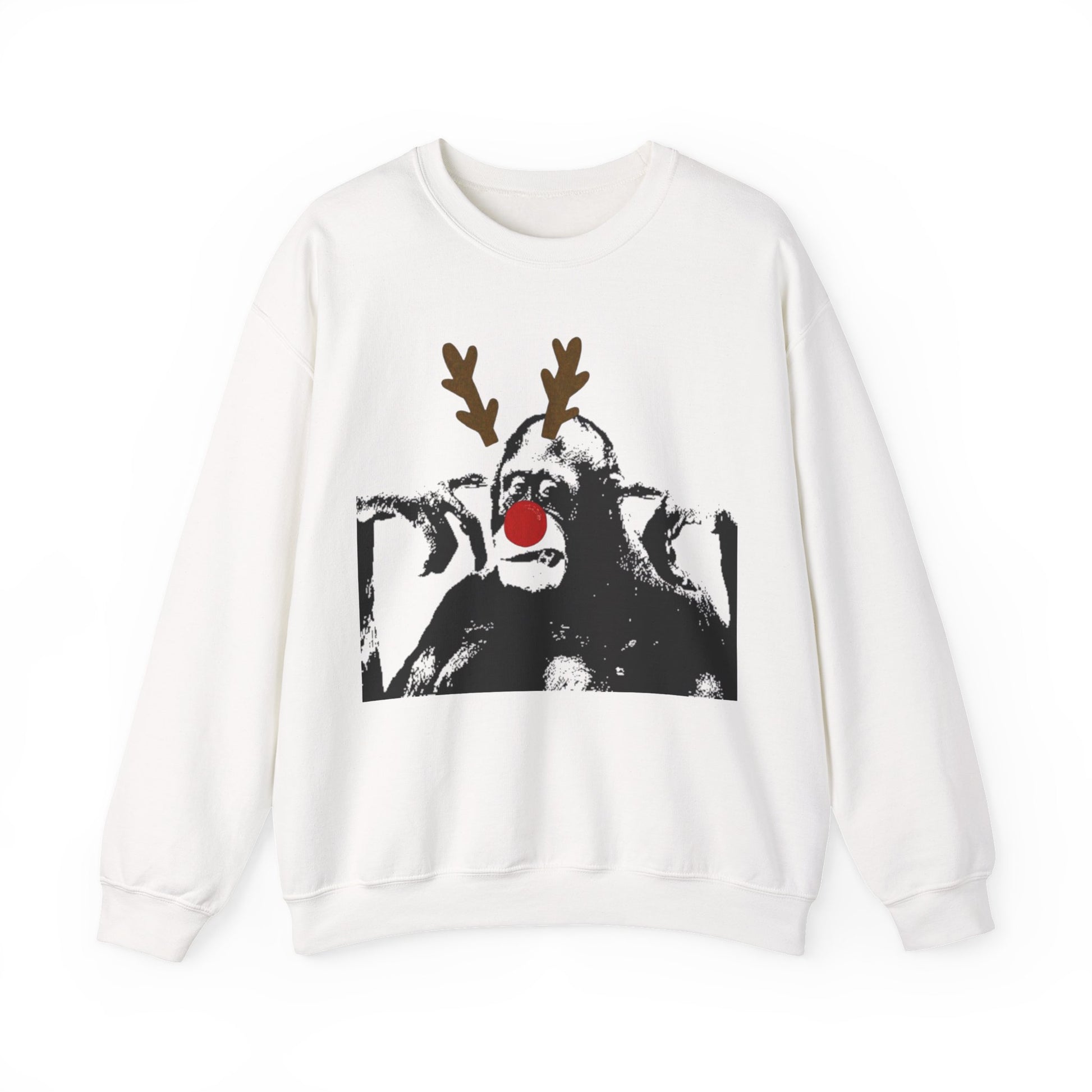 funny monkey Crewneck Sweatshirt with Reindeer Design, Cozy Holiday Apparel, Unisex Christmas Gift, Winter Wear, Novelty Sweatshirt