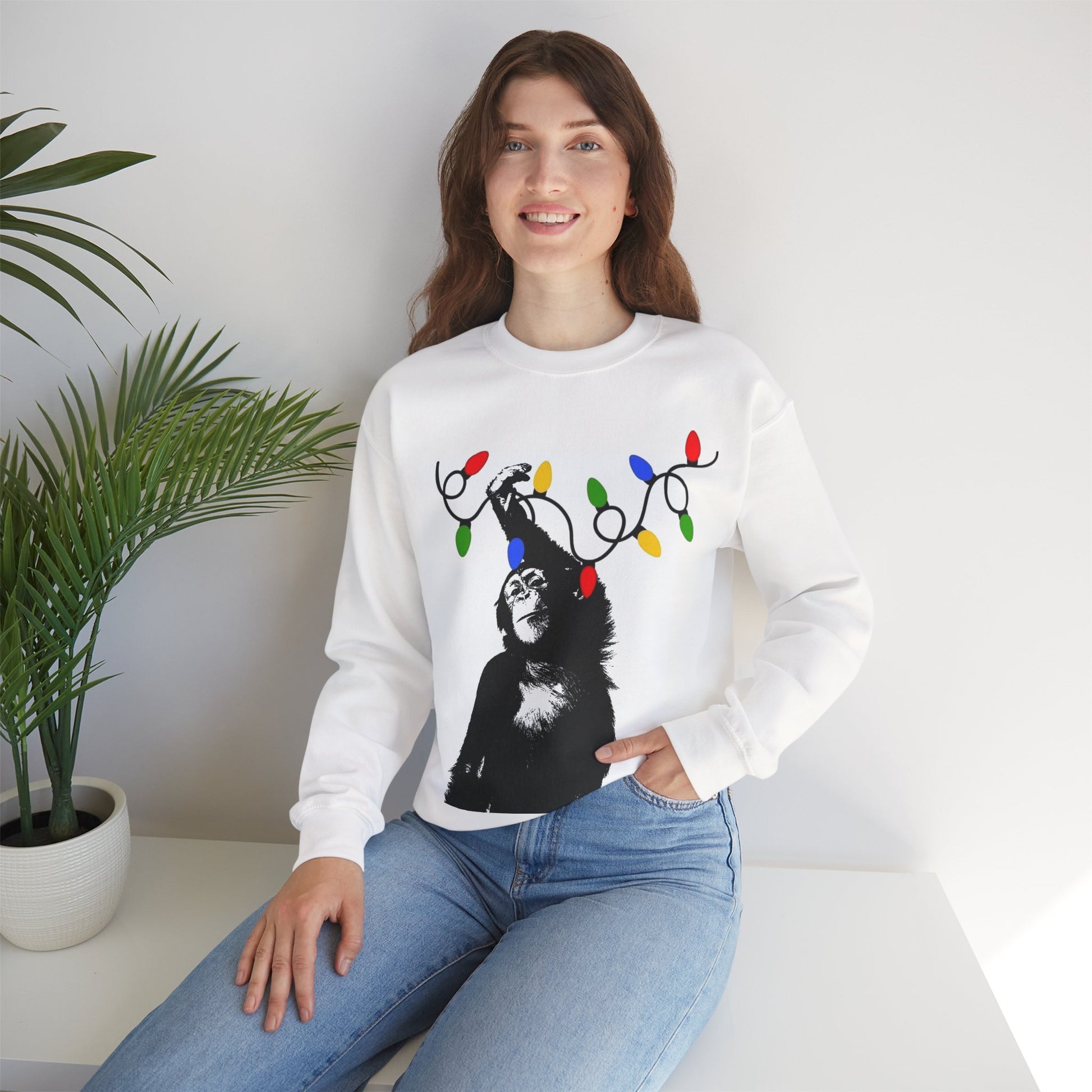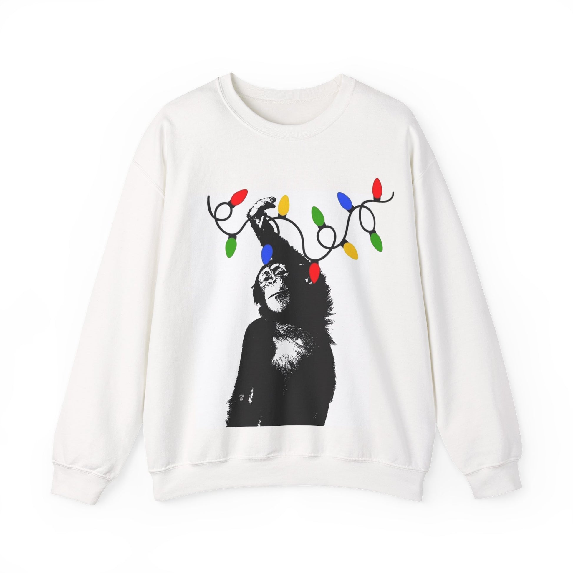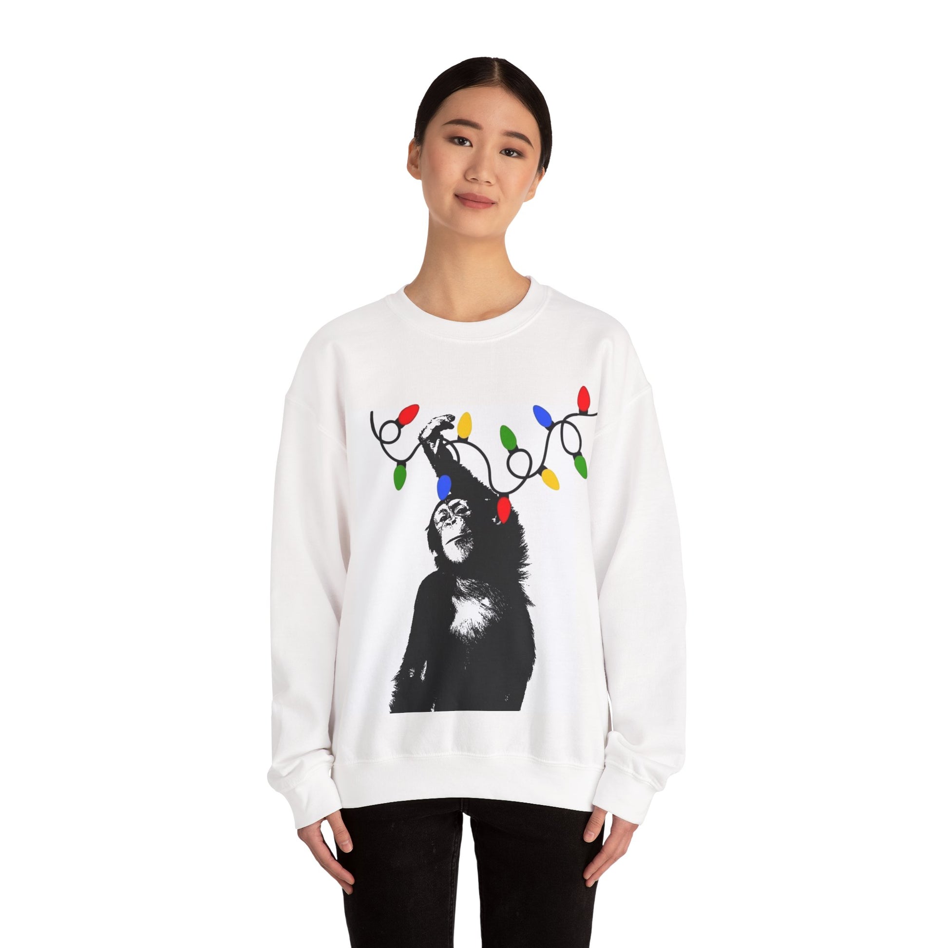This unisex heavy blend crewneck sweatshirt is the perfect choice for cozy gatherings and laid-back weekends. Featuring a charming design of a monkey playfully hanging lights, it adds a whimsical touch to your wardrobe. Whether you're lounging at home, heading out for a casual outing, or celebrating seasonal festivities, this sweatshirt will envelop you in warmth and comfort. Ideal for animal lovers and those who appreciate lighthearted, fun apparel. Celebrate holidays like Christmas, birthdays, or just the joy of everyday life with this unique piece!