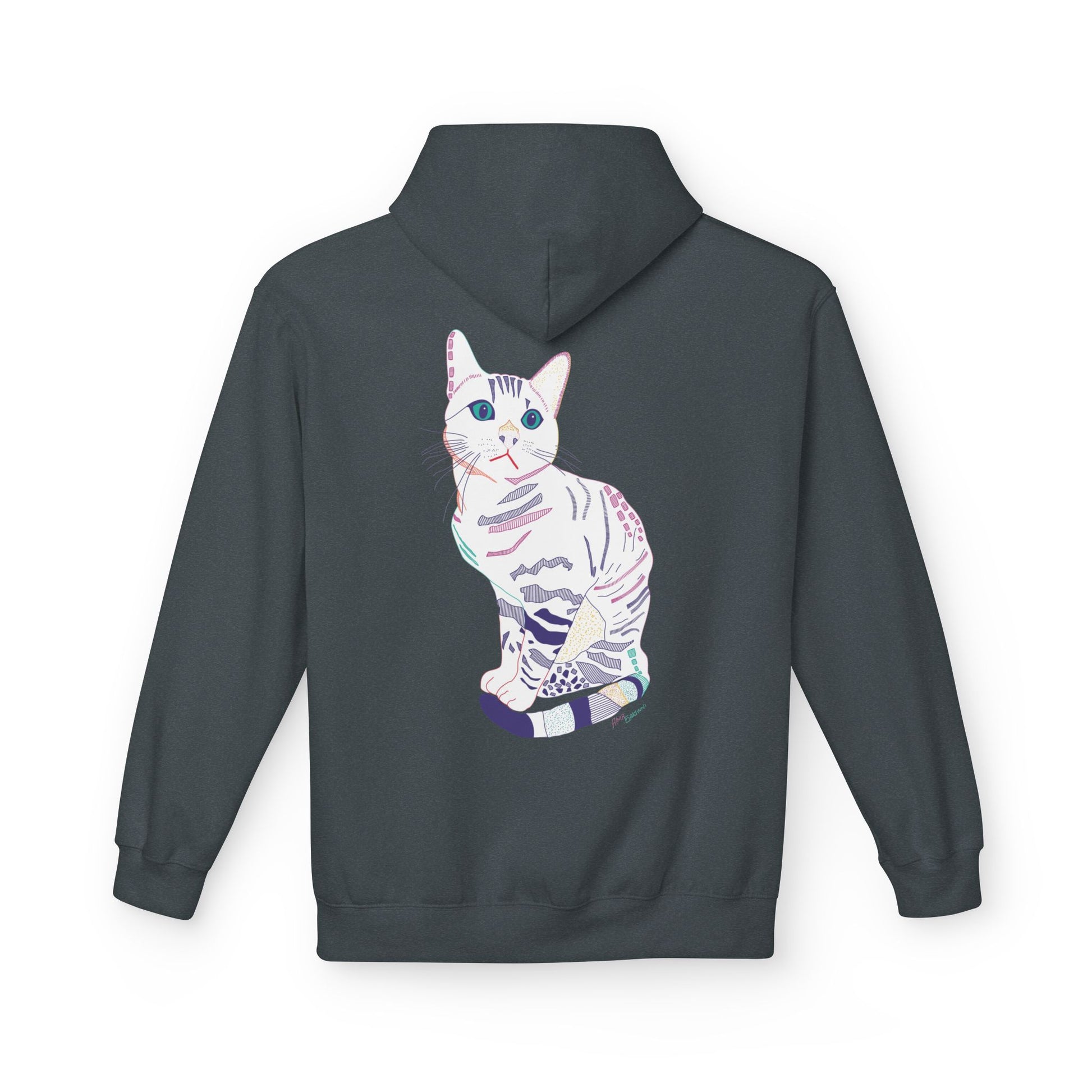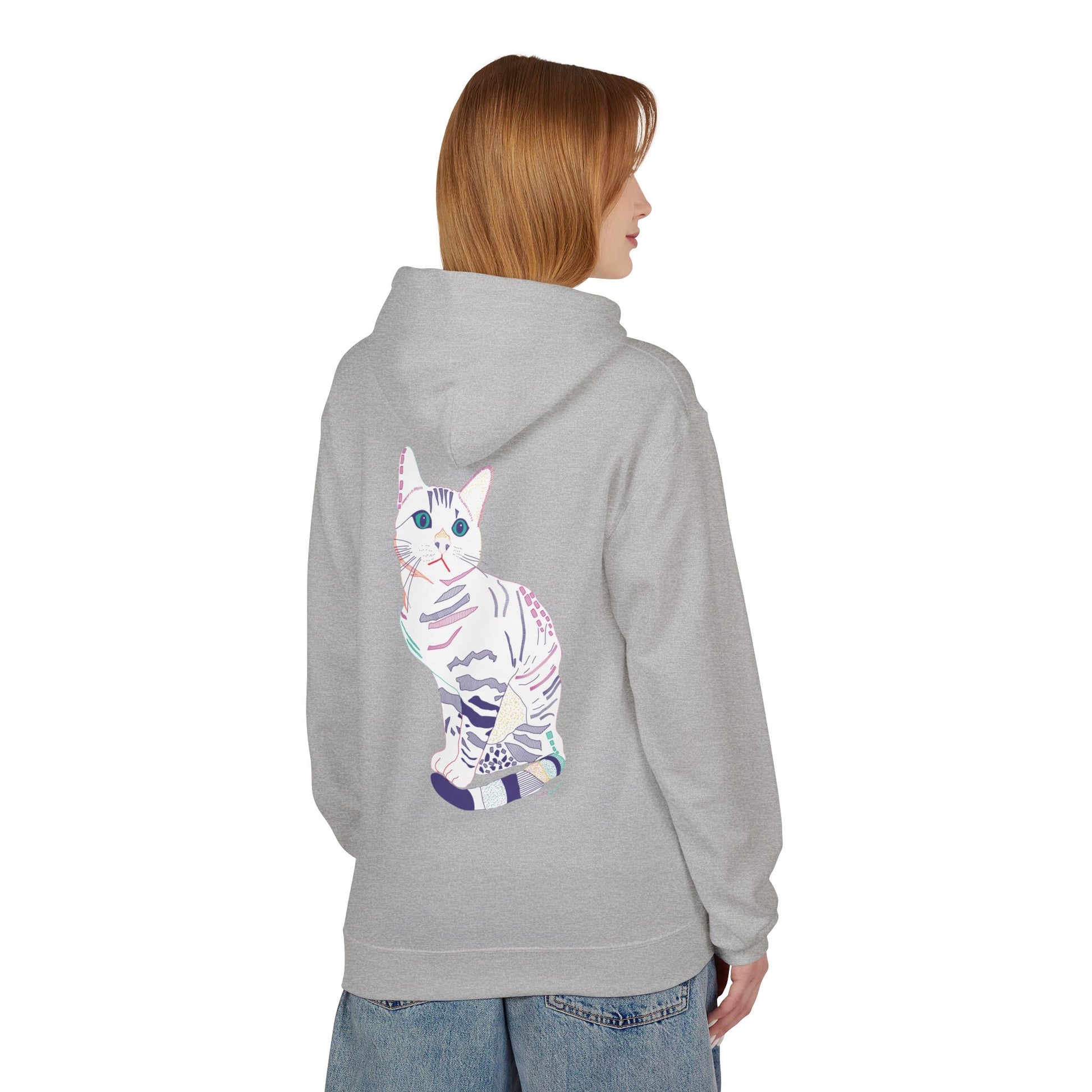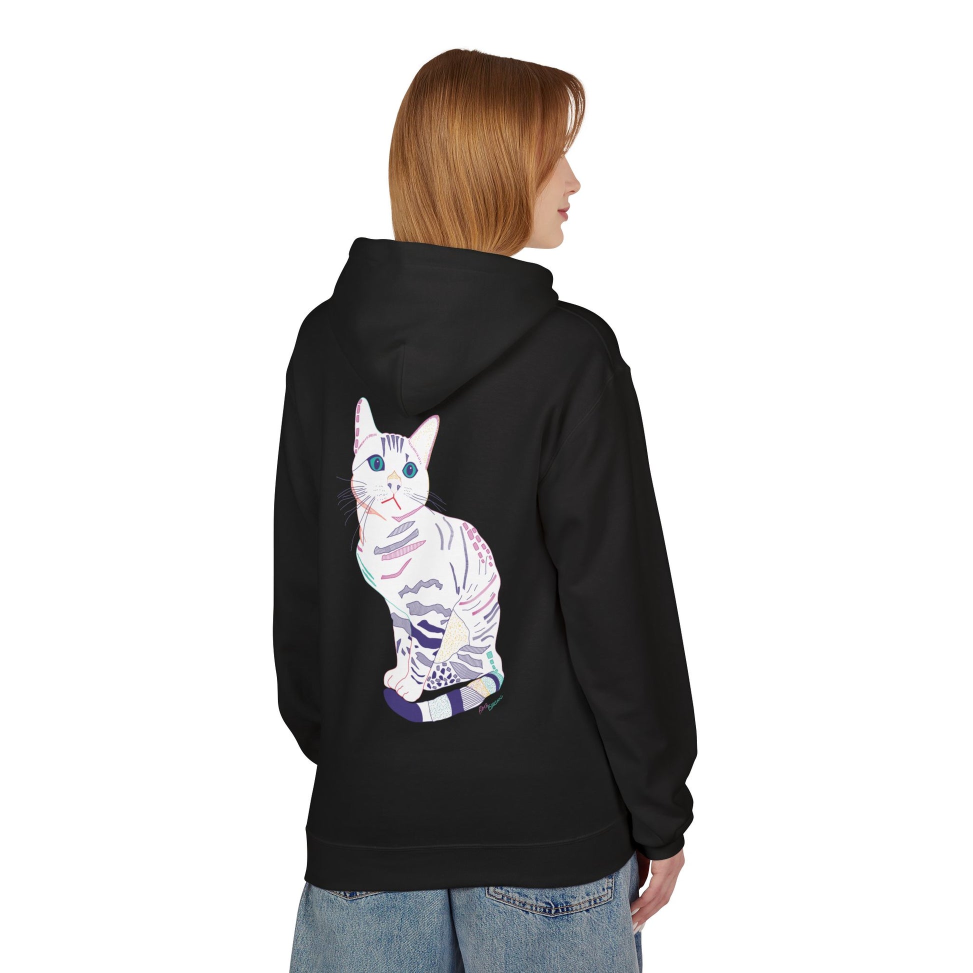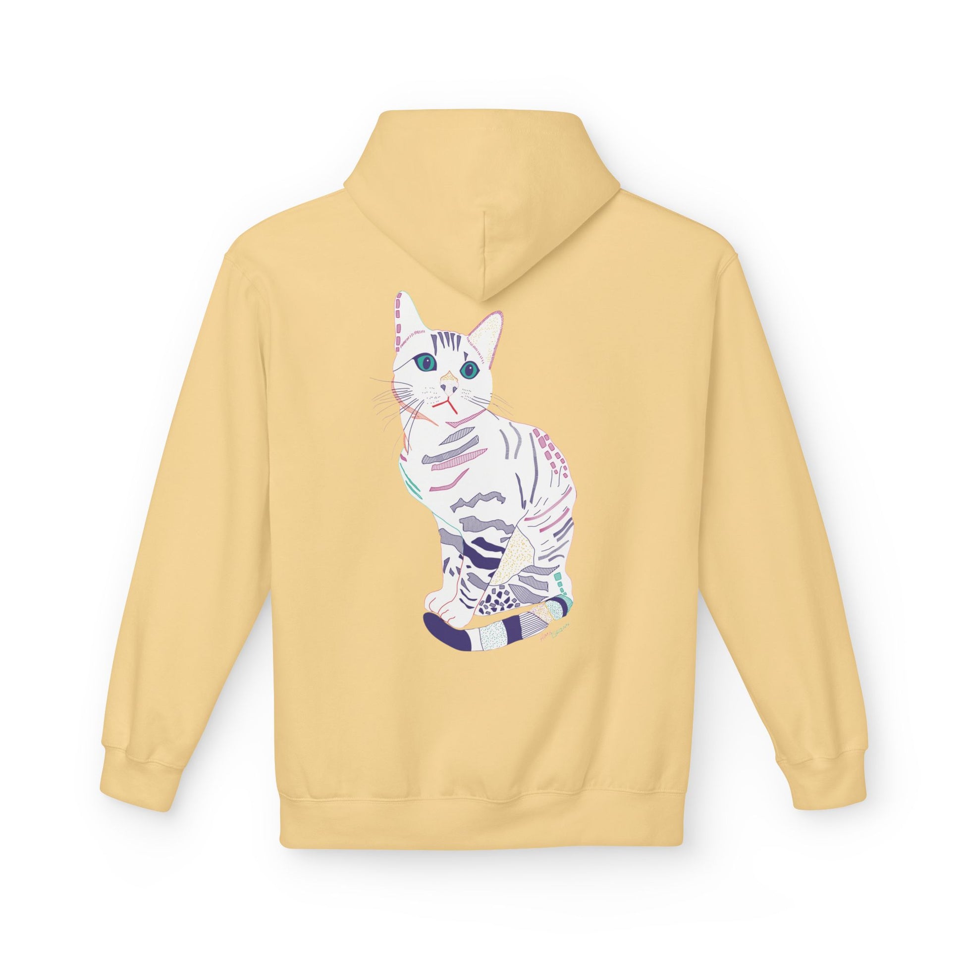 Soft, steady, and a little whimsical — this midweight hoodie feels like a warm pause in a busy day. The front and back feature a delicate watercolor-style cat illustration in soft pastels, a quiet companion that peeks out whether you’re stepping into a cafe or curling up at home. The dropped shoulders and classic fit give it an easy, lived-in silhouette. The pouch pocket keeps hands warm and holds small essentials. Conscious production (OEKO-TEX, FLA and WRAP partnerships) means you’re wearing something made with care for people and the planet. Lightweight enough for layered looks, substantial enough to stand alone on cooler evenings.