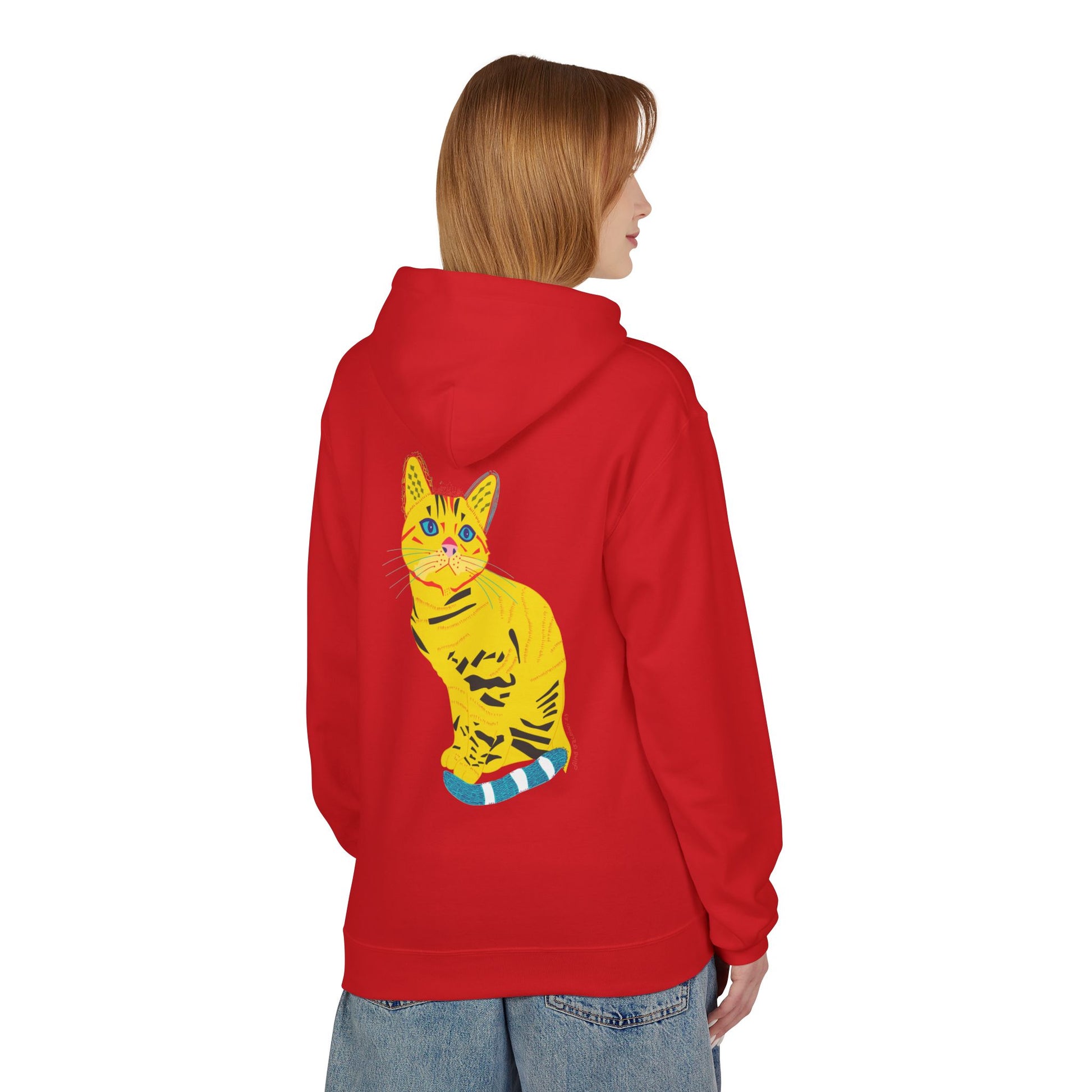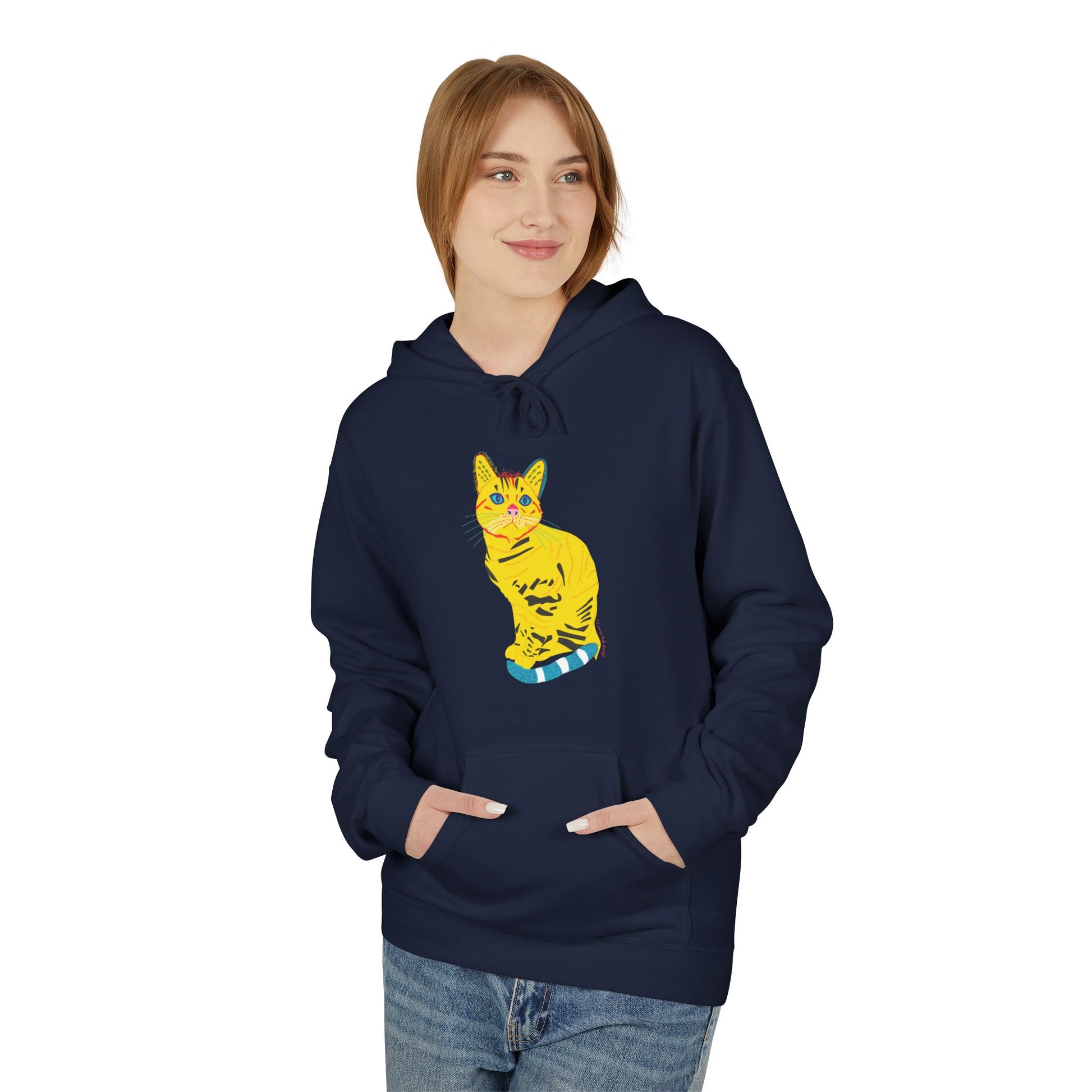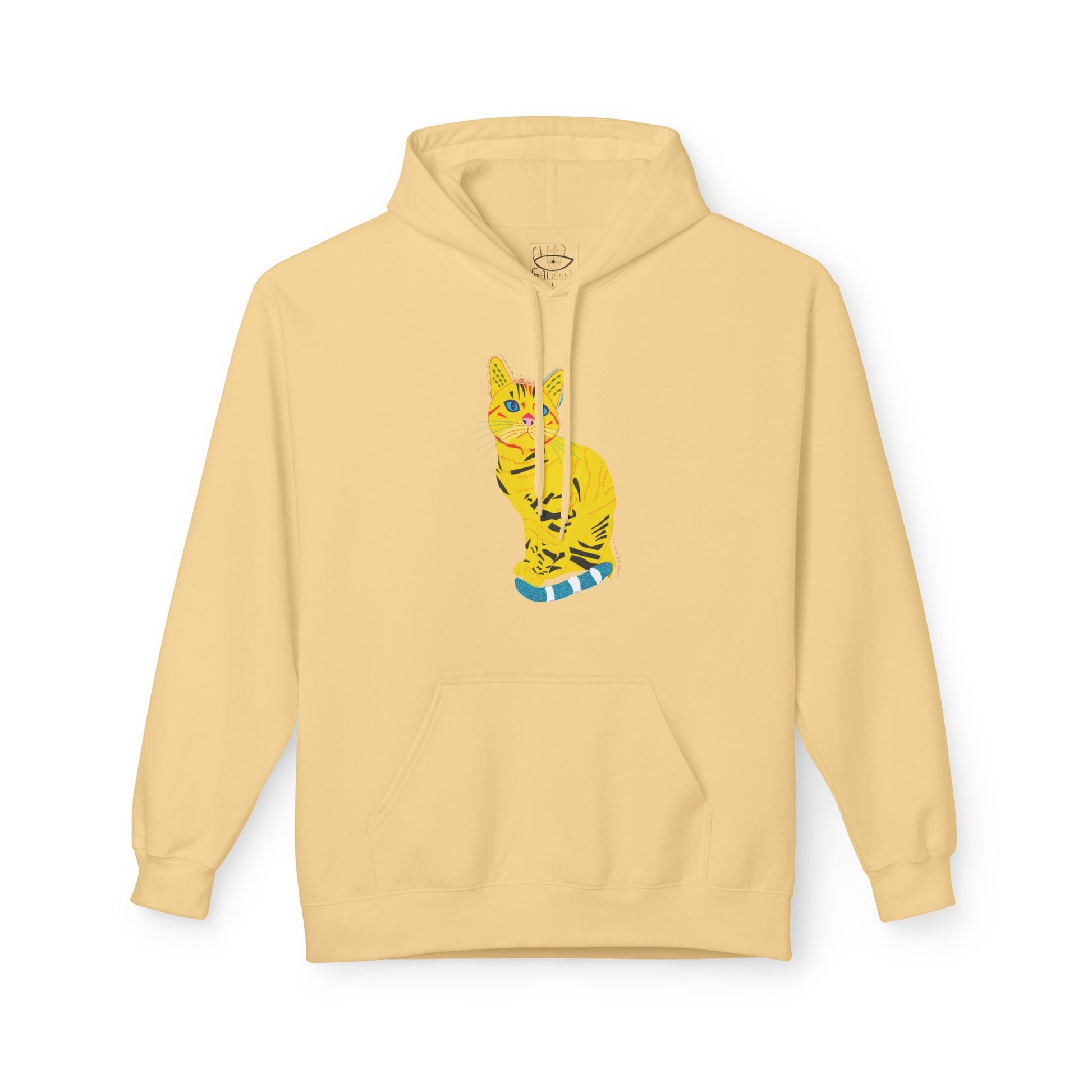 A relaxed midweight hoodie with a hand-drawn, sunlit tabby cat printed in bright yellows, blue accents, and playful stripe details. The dropped shoulders and roomy pouch pocket invite slow mornings, studio sessions, and quiet neighborhood walks. Thoughtfully made in sustainably certified facilities and soft ring-spun cotton blends, this hoodie wears like a familiar friend — warm without weight, breathable without bulk. The cat illustration feels cheerful and slightly whimsical, the kind of design that makes you smile when you catch your reflection. Wear it to cozy up on a rainy afternoon, layer it for an open-air market, or pull it on after a long day of sketching or pet-petting. The subtle artist’s energy pairs well with casual jeans, paint-splattered cuffs, or a favorite pair of comics-laden socks.